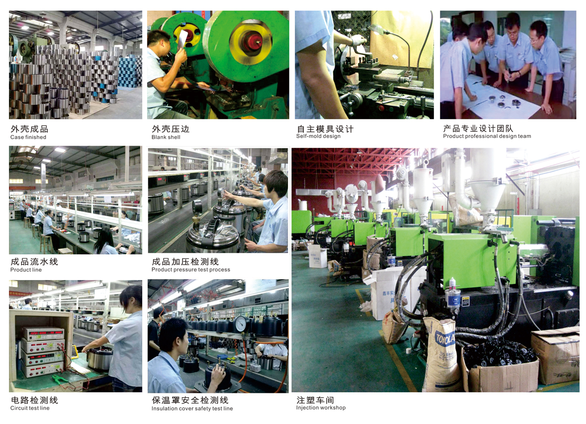 公司一直不斷吸取海內(nèi)外先進(jìn)管理模式,不斷完善自身經(jīng)營理念。從原材料自動裁剪、沖壓、磨砂拋光、鋼蓋自動打磨、外殼成品、自主模具設(shè)計、成品加壓檢測、電路檢測、保溫罩安全檢測等形成一條龍、系列化電壓力鍋小家電制造商。
